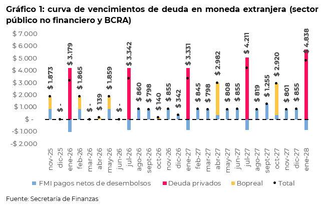 Entre la fecha actual y el final del mandato de Javier Milei en diciembre de 2027, el sector público debe afrontar vencimientos por USD 35.734 millones con el FMI y acreedores privados. Si se amplía el horizonte hasta diciembre de 2031, los vencimientos totales ascienden a USD 121.336 millones.