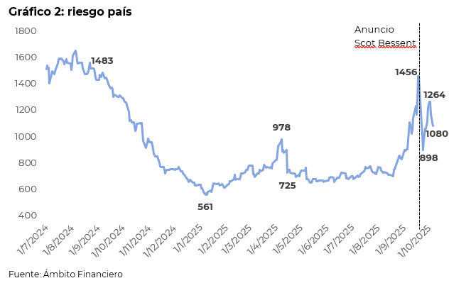 Las dos medidas más fuertes, el anuncio de Scott Bessent y las divisas provistas por el complejo agroexportador, salvaron al gobierno de la situación de la semana del 15 de septiembre. En un comienzo, el mercado tuvo una reacción extremadamente optimista con un dólar oficial cayendo $80 y el riesgo país que estaba en 1456 puntos bajó hasta perforar los 900.